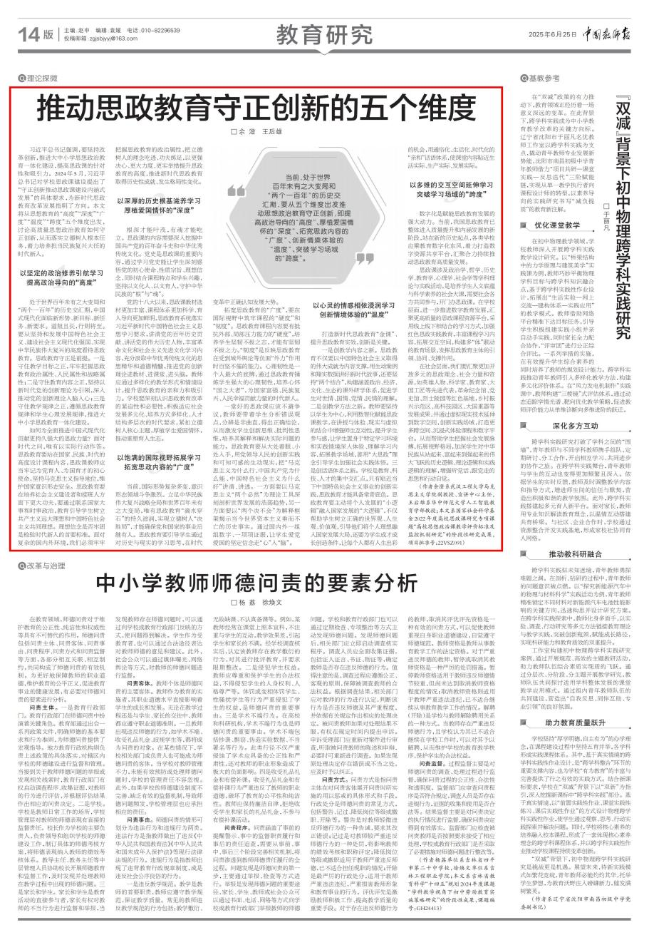 本网讯(通讯员 余澄)6月25日,,,,,我院余澄先生的理论文章《推动思政教育守正立异的五个维度》在《中国西席报》刊发。。。。。。文章从思政教育的“高度”“深度”“广度”“温度”“跨度”五个维度切入,,,,,系统叙述了高质量头脑政治教育守正立异的路径:提升政治导向的“高度”、厚植爱国情怀的“深度”、拓宽思政内容的“广度”、立异情境体验的“温度”、突破学习场域的“跨度”,,,,,旨在资助学生掌握时代脉搏,,,,,拓展视野名堂,,,,,深刻明确中华民族从站起来、富起来到强起来伟大奔腾蕴含的历史逻辑、理论逻辑与实践逻辑,,,,,增强听党话、跟党走的头脑自觉和行动自觉,,,,,从而落实立德树人基础使命,,,,,着力作育继续民族再起大任的时代新人。。。。。。