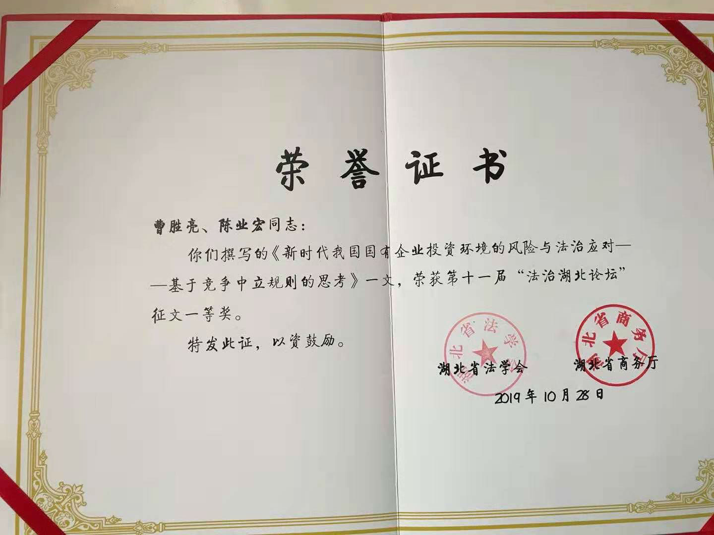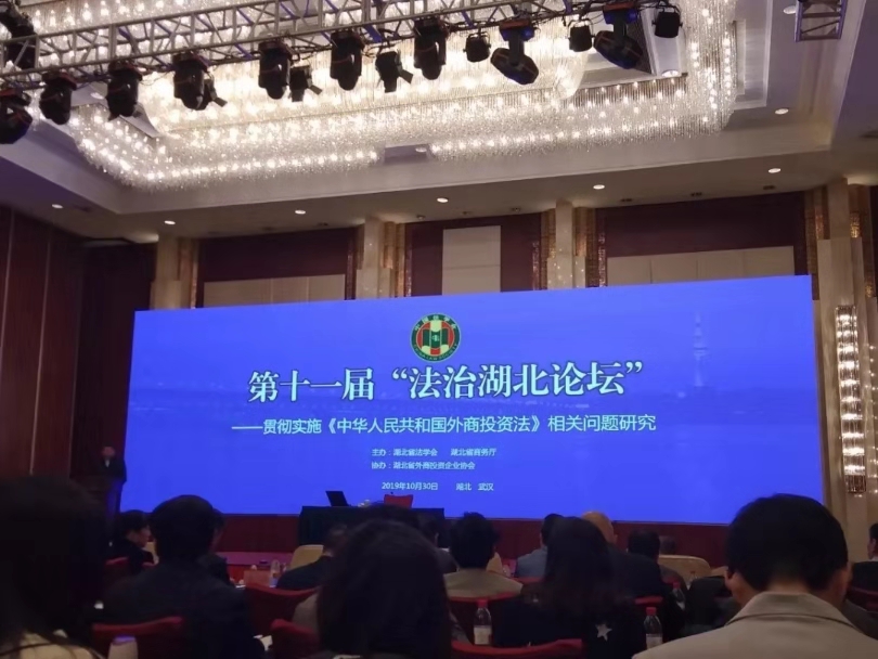 2019年10月30日,,,,,,,第十一届“法治湖北论坛”在武汉市洪山宾馆举行。。。。。。。。本届论坛由湖北省法学会、湖北省商务厅主理,,,,,,,湖北省外商投资企业协会协办。。。。。。。。湖北省法学会会长傅德辉主持论坛主旨报告会,,,,,,,湖北省副省长杨云彦出席论坛并揭晓主要讲话,,,,,,,商务部外资司副司长叶威作了题为“《外商投资法》的立法配景与外商投资的法治包管”的主旨演讲。。。。。。。。省委政法委副书记、省法学会党组书记、常务副会长刘太平出席论坛并主持了论坛总结。。。。。。。。我院院长曹胜亮教授应邀出席论坛并作主题讲话。。。。。。。。
