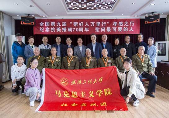 在已往的2020年间,,,,,,,,10月24日至25日,,,,,,,,马院党委书记舒先林教授、团委书记蔡明广向导硕士研究生,,,,,,,,组成社会实践师生团赴孝感加入了天下第九届“帮好人万里行”大型公益运动。。。。。。。。正值重阳佳节和抗美援朝出国作战胜利70周年岁念日这个特殊的日子里,,,,,,,,“帮好人万里行”湖北孝感之行代表团探望并慰问了祖国最可爱的人——9名曾加入抗美援朝战争的退役老兵:王清珍,,,,,,,,李国增、夏登明、闫正腾、朱奇才、李天运、王玉生、钟生全、龚晓初。。。。。。。。