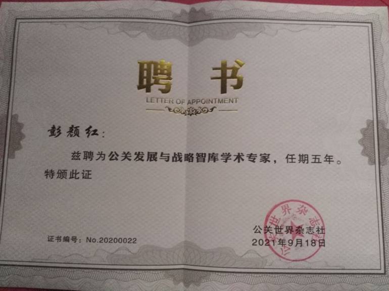 (通讯员蔡明广)克日,,,,,《公关天下》给马院副教授彭颜红博士发来聘书,,,,,约请彭颜红博士为公关生长与战略智库学术专家。。。。。。。。