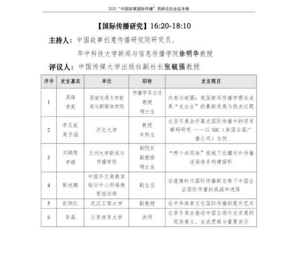(通讯员蔡明广)5月14日-15日,,,,,2022中国故事国际撒播岑岭论坛在华中科技大学举行,,,,,我院副教授彭颜红博士向导硕士研究生加入聚会。。。。。。。。